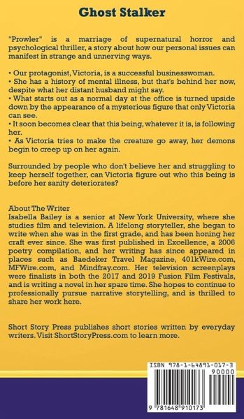 "Prowler" is a marriage of supernatural horror and psychological thriller, a story about how our personal issues can manifest in strange and unnerving ways. • Our protagonist, Victoria, is a successful businesswoman. • She has a history of mental illness, but that's behind her now, despite what her distant husband might say. • What starts out as a normal day at the office is turned upside down by the appearance of a mysterious figure that only Victoria can see. • It soon becomes clear that this being, whatever it is, is following her. • As Victoria tries to make the creature go away, her demons begin to creep up on her again. Surrounded by people who don't believe her and struggling to keep herself together, can Victoria figure out who this being is before her sanity deteriorates? About The Writer Isabella Bailey is a senior at New York University, where she studies film and television. A lifelong storyteller, she began to write when she was in the first grade, and has been honing her craft ever since. She was first published in Excellence, a 2006 poetry compilation, and her writing has since appeared in places such as Baedeker Travel Magazine, 401kWire.com, MFWire.com, and Mindfray.com. Her television screenplays were finalists in both the 2017 and 2019 Fusion Film Festivals, and is writing a novel in her spare time. She hopes to continue to professionally pursue narrative storytelling, and is thrilled to share her work here. Short Story Press publishes short stories written by everyday writers.