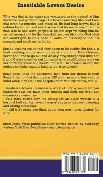 Who was that in the water she wondered as she peered at him throw the over grown foliage? He looked amazing. She could see that even his muscles had muscles. He had long brown hair a golden brown tan and every move that he made was fluid this man was in one word gorgeous. As she kept watching him he turned around and let the waterfall run over his body. God what she would give to be a bead of water on his body to feel his strength and touch on her body. Sonja’s dreams are so real they seem to be reality. But Sonja, a hard working, single receptionist at a clinic in New Orleans, never had time to go out and do anything unexpected until her friend Cassie takes her out for breakfast to a café before work on her birthday. There she meets Eric, a tall, handsome waiter; she notices he looks vaguely familiar but from where? Sonja soon finds the handsome man from her dream is real! Sonja finds out that the guy has ESP and can talk to her with his mind when they are in the hospital room with his Nanna, Mrs. B. • Insatiable Lovers Desires is a story of how a young woman learns to trust her most inner desires and finds out even her dreams can come true. • This story shows how the caring for an older woman in a hospital bed can turn even the most shy in to the most outgoing and willing individual. • It will truly make you think about your most inner desires for sure. Short Story Press publishes short stories written by everyday writers.