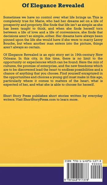 Sometimes we have no control over what life brings us. This is completely true for Marie who had her dreams set on a life of prosperity and propriety. She finds that life isn't as simple as she has been grown up to think, and when she finds herself torn between a life of love and a life of convenience, she finds that decisions aren't so simple either. Her dreams have always been pinned upon the life she would have if she were to marry Leroy Bouche; but when another man enters into the picture, things aren't always so certain. The story, Elegance Revealed is an epic story, set in 19th century New Orleans. In this city, in this time, there is no limit to the opportunity or experiences, which can be found. Here the mix of cultures, the promise of enterprise, and the new freedoms which are to be discovered lead the heart to endless possibilities and a chance of anything that you choose. Find yourself enraptured in the opportunities and choices a young girl must make in this age; particularly, where it comes to matters of the heart, what is expected of her and what she is able to choose for herself. Short Story Press publishes short stories written by everyday writers.