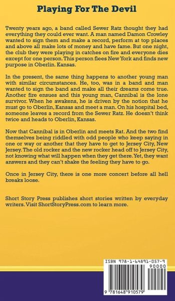 Twenty years ago, a band called Sewer Ratz thought they had everything they could ever want. A man named Damon Crowley wanted to sign them and make a record, perform at top places and above all make lots of money and have fame. But one night, the club they were playing in catches on fire and everyone dies except for one person. This person flees New York and finds new purpose in Oberlin. Kansas.In the present, the same thing happens to another young man with similar circumstances. He, too, was in a band and man wanted to sign the band and make all their dreams come true. Another fire ensues and this young man, Cannibal is the lone survivor. When he awakens, he is driven by the notion that he must go to Oberlin, Kansas and meet a man. On his hospital bed, someone leaves a record from the Sewer Ratz. He doesn't think twice and heads to Oberlin, Kansas. Now that Cannibal is in Oberlin and meets Rat. And the two find themselves being riddled with odd people who keep saying in one or way or another that they have to get to Jersey City, New Jersey. The old rocker and the new rocker head off to Jersey City, not knowing what will happen when they get there. Yet, they want answers and they can't shake the feeling they have to go. Once in Jersey City, there is one more concert before all hell breaks loose. Short Story Press publishes short stories written by everyday writers.