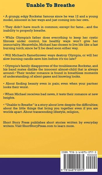 • A grungy, edgy Rockstar famous since he was 12 and a young model, innocent in her ways and just coming into her own. • They didn’t have much in common; except for fame…and the inability to properly breathe. • While Olympia’s father does everything to keep her cystic fibrosis under control, his healthy ways won’t give her immortality. Meanwhile, Michael has chosen to live life like a fast burning torch; since he’ll be dead soon either way. • Will Michael’s flamethrower ways destroy Olympia, or will her slow burning candle save him before it’s too late? • Olympia’s family disapproves of the troublesome Rockstar, and his band mates dislike the innocent almost-child that is always around. • Their tender romance is found in breathless moments of understanding; of silent gazes and knowing looks. • About finding beauty even in pain; even when your partner looks their worst. • When Michael receives bad news, it tests their romance at new heights. • "Unable to Breathe" is a story about love despite the difficulties; about the little things that bring you together even if you are worlds apart. About transcending lifestyle, religion, professions; all differences; to be with the one you love. • Is it truly till death do us part, or is there something after that can be shared? Short Story Press publishes short stories written by everyday writers.