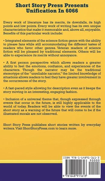 Every work of literature has its merits, its downfalls, its high points and low points. Every work of writing has its own unique characteristics that make it memorable and, above all, enjoyable. Benefits of this particular work include: • Integrated elements of the science fiction genre with the ability to please fans while still accommodating the different tastes of readers who favor other genres. Veteran readers of science fiction will be pleased by traditional elements. Others will be able to experience its merits without annoyance. • A first person perspective which allows readers a greater ability to feel the emotions, confusion, and experiences of the characters. Though the narrator may be the traditional stereotype of the "unreliable narrator," the limited knowledge of situations allows readers to feel they have greater involvement in the occurrences of the story. • A fast-paced style allowing for description even as it keeps the story moving in an interesting, engaging fashion. • Inclusion of a universal theme that, though expressed through events that occur in the future, is still highly applicable to the world of today. Readers will be able to view the events of the short story as a warning of the future that will come to be if the illustrated morals are not observed. Short Story Press publishes short stories written by everyday writers.