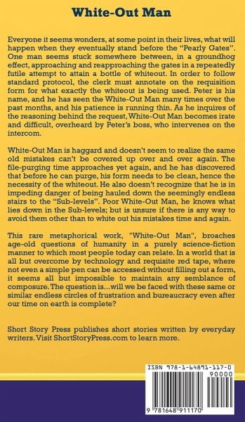 Everyone it seems wonders, at some point in their lives, what will happen when they eventually stand before the "Pearly Gates"? One man seems stuck somewhere between, in a groundhog effect, approaching and re-approaching the Gates in a repeatedly futile attempt to attain a bottle of white-out. In order to follow standard protocol, the clerk must annotate on the requisition form what exactly the white-out is being used for. Peter is his name, and he has seen the White-Out Man many times over the past months and his patience is running thin. As he inquires of the reasoning behind the request, White-Out Man becomes irate and difficult, overheard by Peter's Boss who intervenes on the intercom. White-Out Man is haggard, and doesn't seem to realize that the same old mistakes can't be covered up over, and over again. The file-purging time approaches yet again, and he has discovered that before he can purge, his form needs to be clean, hence the necessity of the white-out. He also doesn't recognize that he is in impeding danger of being hauled down the seemingly endless stairs to the "Sub-levels". Poor White-Out Man, he knows what lies down in the Sub-levels; but is unsure if there is any way to avoid them other than to white-out his mistakes time and again. This rare metaphorical work, White-Out Man, broaches age-old questions of humanity in a purely science fiction manner that most people today can relate to. In a world that is all but overcome by technology and requisite red tape, where not even a simple pen can be accessed without filling out a form, it seems all but impossible to maintain any semblance of composure. The question is… will we be faced with these same or similar endless circles of frustration and bureaucracy even after our time on Earth is complete? Short Story Press publishes short stories written by everyday writers.