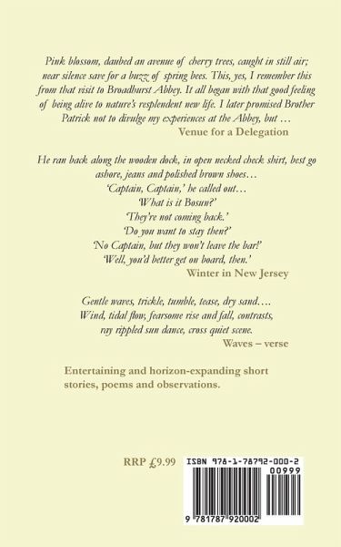 Pink blossom, daubed an avenue of cherry trees, caught in still air; near silence save for a buzz of spring bees. This, yes, I remember this from that visit to Broadhurst Abbey. It all began with that good feeling of being alive to nature's resplendent new life. I later promised Brother Patrick not to divulge my experiences at the Abbey, but ...Venue for a Delegation He ran back along the wooden dock, in open necked check shirt, best go ashore, jeans and polished brown shoes...'Captain, Captain,' he called out...'What is it Bosun?''They're not coming back.''Do you want to stay then?''No Captain, but they won't leave the bar!''Well, you'd better get on board, then.'Winter in New Jersey Gentle waves, trickle, tumble, tease, dry sand....Wind, tidal flow, fearsome rise and fall, contrasts,ray rippled sun dance, cross quiet scene.Waves - verse Entertaining and horizon-expanding short stories, poems and observations.
