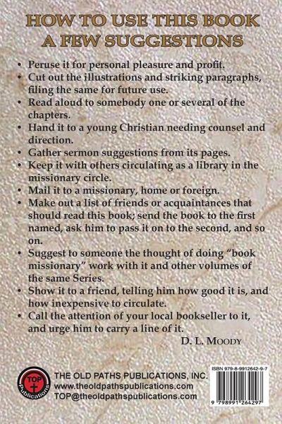 D. L. Moody (1837-1899), an American evangelist, said:HOW TO USE THIS BOOKA FEW SUGGESTIONSPeruse it for personal pleasure and profit. Cut out the illustrations and striking paragraphs, filing the same for future use. Read aloud to somebody one or severalof the chapters. Hand it to a young Christian needing counsel and direction. Gather sermon suggestions from its pages. Keep it with others circulating as a library in the missionary circle. Mail it to a missionary, home or foreign. Make out a list of friends or acquaintances that should read this book; send the book to the first named, ask himto pass it on to the second, and so on. Suggest to someone the thought of doing "book missionary" work with it and other volumes of the same Series. Show it to a friend,telling him how good it is, and how inexpensive to circulate. Call the attention of your local bookseller to it,and urge him to carry a line of the MOODY COLPORTAGE LIBRARY books.