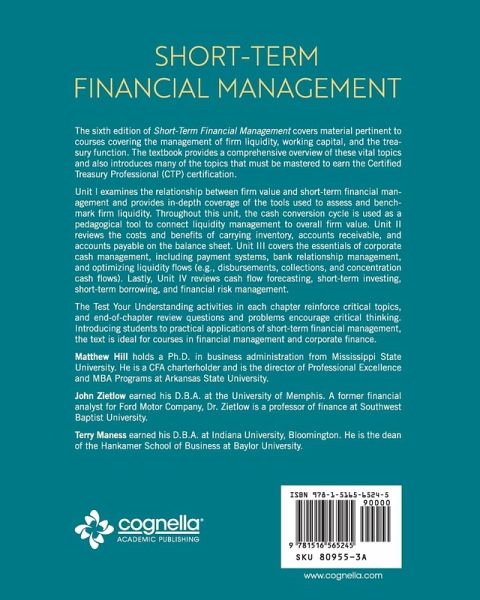 The sixth edition of Short-Term Financial Management covers material pertinent to courses covering the management of firm liquidity, working capital, and the treasury function. The textbook provides a comprehensive overview of these vital topics and also introduces many of the topics that must be mastered to earn the Certified Treasury Professional (CTP) certification. Unit I examines the relationship between firm value and short-term financial management and provides in-depth coverage of the tools used to assess and benchmark firm liquidity. Throughout this unit, the cash conversion cycle is used as a pedagogical tool to connect liquidity management to overall firm value. Unit II reviews the costs and benefits of carrying inventory, accounts receivable, and accounts payable on the balance sheet. Unit III covers the essentials of corporate cash management, including payment systems, bank relationship management, and optimizing liquidity flows (e.g., disbursements, collections, and concentration cash flows). Lastly, Unit IV reviews cash flow forecasting, short-term investing, short-term borrowing, and financial risk management. The Test Your Understanding activities in each chapter reinforce critical topics, and end-of-chapter review questions and problems encourage critical thinking. Introducing students to practical applications of short-term financial management, the text is ideal for courses in financial management and corporate finance.