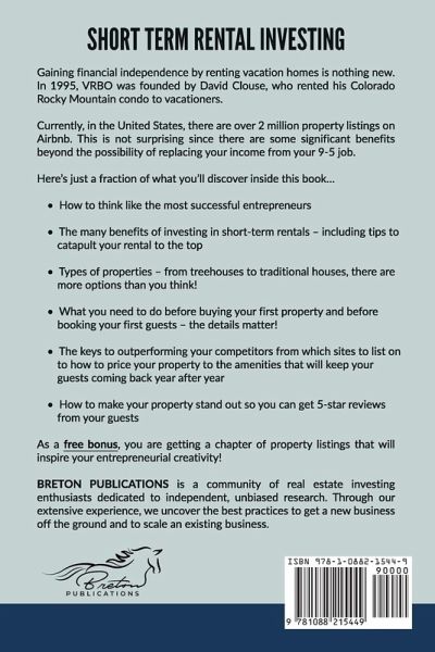 Want to have a vacation property business? One that will fund your retirement? And give you the free time you have always dreamed of? Gaining financial independence by renting vacation homes is nothing new. Currently, in the United States, there are over 2 million property listings on Airbnb. This is not surprising since there are some significant benefits beyond the possibility of replacing your income from your 9-5 job. At the top of the list is having a vacation home where you can get away and relax that practically pays for itself. Also on the list of benefits are equity appreciation and tax deductions. This type of business is unique and satisfying because you can strike a balance between being an entrepreneur and giving guests the opportunity to create life-long memories. This book is your starting point. It will give you the tips and strategies you need to be able to run your business efficiently and provide the best customer service possible. Profits and smiling guests are inevitable. You will discover - *How to think like the most successful entrepreneurs *The many benefits of investing in short-term rentals - including tips to catapult your rental to the top *Types of properties - from treehouses to traditional houses, there are more options than you think! *What you need to do before buying your first property and before booking your first guests - the details matter! *The keys to outperforming your competitors from which sites to list on to how to price your property to the amenities that will keep your guests coming back year after year *How to make your property stand out so you can get 5-star reviews from your guests You can set up this business without any prior knowledge about the real estate industry. Investing in vacation homes is one of the simplest ways to start your own business and pave a path toward the financial future you want. What are you waiting for? There's no time like the present!