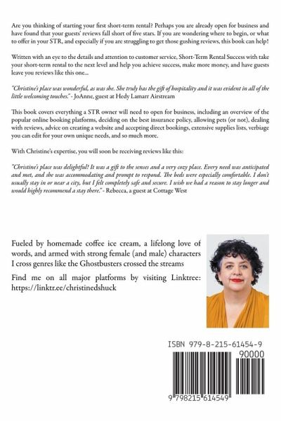 Are you thinking of starting your first short-term rental? Perhaps you are already open for business and have found that your guests' reviews fall short of five stars. If you are wondering where to begin, or what to offer in your STR, and especially if you are struggling to get those gushing reviews, this book can help! Written with an eye to the details and attention to customer service, Short-Term Rental Success with take your short-term rental to the next level and help you achieve success, make more money, and have guests leave you reviews like this one... "Christine's place was wonderful, as was she. She truly has the gift of hospitality and it was evident in all of the little welcoming touches." - JoAnne, guest at Hedy Lamarr Airstream This book covers everything a STR owner will need to open for business, including an overview of the popular online booking platforms, deciding on the best insurance policy, allowing pets (or not), dealing with reviews, advice on creating a website and accepting direct bookings, extensive supplies lists, verbiage you can edit for your own unique needs, and so much more. With Christine's expertise, you will soon be receiving reviews like this: "Christine's place was delightful! It was a gift to the senses and a very cozy place. Every need was anticipated and met, and she was accommodating and prompt to respond. The beds were especially comfortable. I don't usually stay in or near a city, but I felt completely safe and secure. I wish we had a reason to stay longer and would highly recommend a stay there." - Rebecca, a guest at Cottage West