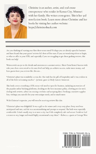 Are you thinking of starting your first short-term rental? Perhaps you are already open for business and have found that your guests' reviews fall short of five stars. If you are wondering where to begin, or what to offer in your STR, and especially if you are struggling to get those gushing reviews, this book can help! Written with an eye to the details and attention to customer service, Short-Term Rental Success with take your short-term rental to the next level and help you achieve success, make more money, and have guests leave you reviews like this one... "Christine's place was wonderful, as was she. She truly has the gift of hospitality and it was evident in all of the little welcoming touches." - JoAnne, guest at Hedy Lamarr Airstream This book covers everything a STR owner will need to open for business, including an overview of the popular online booking platforms, deciding on the best insurance policy, allowing pets (or not), dealing with reviews, advice on creating a website and accepting direct bookings, extensive supplies lists, verbiage you can edit for your own unique needs, and so much more. With Christine's expertise, you will soon be receiving reviews like this: "Christine's place was delightful! It was a gift to the senses and a very cozy place. Every need was anticipated and met, and she was accommodating and prompt to respond. The beds were especially comfortable. I don't usually stay in or near a city, but I felt completely safe and secure. I wish we had a reason to stay longer and would highly recommend a stay there." - Rebecca, a guest at Cottage West