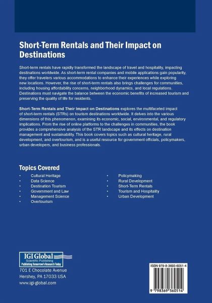 Short-term rentals have rapidly transformed the landscape of travel and hospitality, impacting destinations worldwide. As short-term rental companies and mobile applications gain popularity, they offer travelers various accommodations to enhance their experiences while exploring new locations. However, the rise of short-term rentals also brings challenges for communities, including housing affordability concerns, neighborhood dynamics, and local regulations. Destinations must navigate the balance between the economic benefits of increased tourism and preserving the quality of life for residents. Short-Term Rentals and Their Impact on Destinations explores the multifaceted impact of short-term rentals (STRs) on tourism destinations worldwide. It delves into the various dimensions of this phenomenon, examining its economic, social, environmental, and regulatory implications. From the rise of online platforms to the challenges in communities, the book provides a comprehensive analysis of the STR landscape and its effects on destination management and sustainability. This book covers topics such as cultural heritage, rural development, and overtourism, and is a useful resource for government officials, policymakers, urban developers, and business professionals.