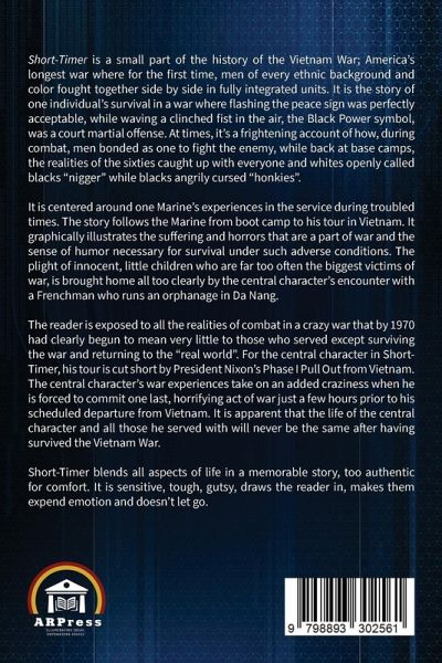 Short-Timer is a small part of the history of the Vietnam War; America's longest war where for the first time, men of every ethnic background and color fought together side by side in fully integrated units. It is the story of one individual's survival in a war where flashing the peace sign was perfectly acceptable, while waving a clinched fist in the air, the Black Power symbol, was a court martial offense. At times, it's a frightening account of how, during combat, men bonded as one to fight the enemy, while back at base camps, the realities of the sixties caught up with everyone and whites openly called blacks "nigger" while blacks angrily cursed "honkies". It is centered around one Marine's experiences in the service during troubled times. The story follows the Marine from boot camp to his tour in Vietnam. It graphically illustrates the suffering and horrors that are a part of war and the sense of humor necessary for survival under such adverse conditions. The plight of innocent, little children who are far too often the biggest victims of war, is brought home all too clearly by the central character's encounter with a Frenchman who runs an orphanage in Da Nang. The reader is exposed to all the realities of combat in a crazy war that by 1970 had clearly begun to mean very little to those who served except surviving the war and returning to the "real world". For the central character in Short-Timer, his tour is cut short by President Nixon's Phase I Pull Out from Vietnam. The central character's war experiences take on an added craziness when he is forced to commit one last, horrifying act of war just a few hours prior to his scheduled departure from Vietnam. It is apparent that the life of the central character and all those he served with will never be the same after having survived the Vietnam War. Short-Timer blends all aspects of life in a memorable story, too authentic for comfort. It is sensitive, tough, gutsy, draws the reader in, makes themexpend emotion and doesn't let go.