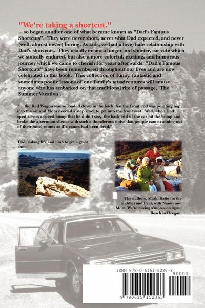 "We're taking a shortcut." So began another one of what became known as "Dad's Famous Shortcuts". They were never short, never what Dad expected, and they were never (well, almost never) boring. As kids, we had a love/hate relationship with Dad's shortcuts. They usually meant a longer, not shorter, car ride which we stoically endured, but also a more colorful, exciting, and humorous journey which we came to cherish for years afterwards. "Dad's Famous Shortcuts" have been remembered throughout our lives and are now celebrated in this book. This collection of funny, fantastic, and sometimes poetic lessons of one family's misadventures will amuse anyone who has embarked on that traditional rite of passage, "The summer vacation".