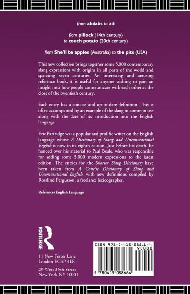 From abdabs to zit From pillock (14th century) to couch potato (20th century) From She'll be apples (Australia) to the pits (USA) This new collection brings together some 5,000 contemporary slang expressions originating in all parts of the English-speaking world. It gives clear and concise definitions of each word, supplemented by examples of their use and information about where and when they came into being. This entertaining reference work will be of use to students of English at all levels and a source of fascination to word-lovers throughout the world.