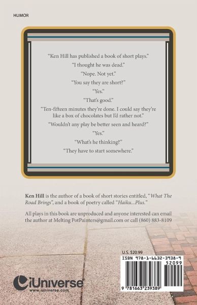 "Ken Hill has published a book of short plays." "I thought he was dead." "Nope. Not yet." "You say they are short?" "Yes." "That's good." "Ten-fifteen minutes they're done. I could say they're like a box of chocolates but I'd rather not." "Wouldn't any play be better seen and heard?" "Yes." "What's he thinking?" "They have to start somewhere."