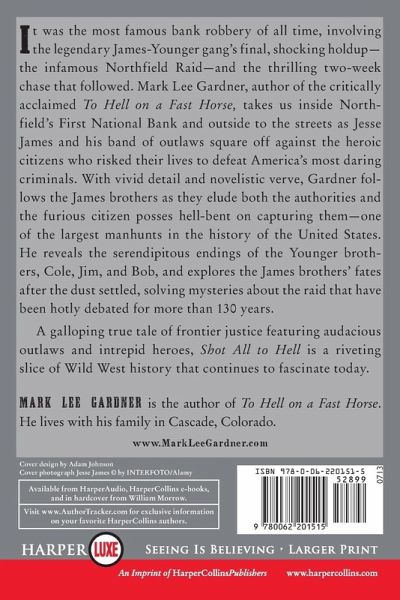 It was the most famous bank robbery of all time, involving the legendary James-Younger gang's final, shocking holdup?the infamous Northfield Raid?and the thrilling two-week chase that followed. Mark Lee Gardner, author of the critically acclaimed To Hell on a Fast Horse, takes us inside Northfield's First National Bank and outside to the streets as Jesse James and his band of outlaws square off against the heroic citizens who risked their lives to defeat America's most daring criminals. With vivid detail and novelistic verve, Gardner follows the James brothers as they elude both the authorities and the furious citizen posses hell-bent on capturing them?one of the largest manhunts in the history of the United States. He reveals the serendipitous endings of the Younger brothers, Cole, Jim, and Bob, and explores the James brothers' fates after the dust settled, solving mysteries about the raid that have been hotly debated for more than 130 years. A galloping true tale of frontier justice featuring audacious outlaws and intrepid heroes, Shot All to Hell is a riveting slice of Wild West history that continues to fascinate today.