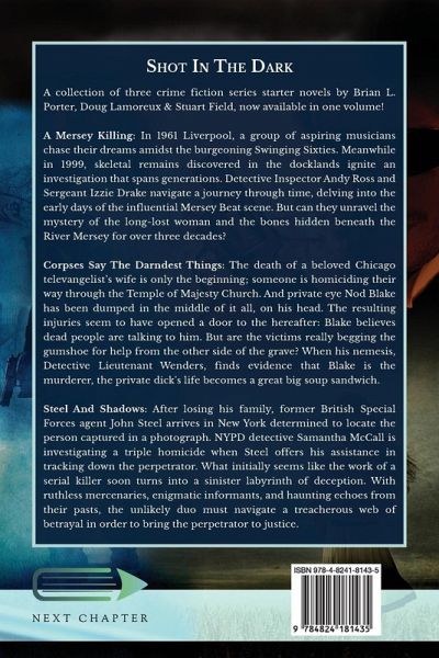 A collection of three crime fiction series starter novels by Brian L. Porter, Doug Lamoreux & Stuart Field, now available in one volume! A Mersey Killing: In 1961 Liverpool, a group of aspiring musicians chase their dreams amidst the burgeoning Swinging Sixties. Meanwhile in 1999, skeletal remains discovered in the docklands ignite an investigation that spans generations. Detective Inspector Andy Ross and Sergeant Izzie Drake navigate a journey through time, delving into the early days of the influential Mersey Beat scene. But can they unravel the mystery of the long-lost woman and the bones hidden beneath the River Mersey for over three decades? Corpses Say The Darndest Things: The death of a beloved Chicago televangelist's wife is only the beginning; someone is homiciding their way through the Temple of Majesty Church. And private eye Nod Blake has been dumped in the middle of it all, on his head. The resulting injuries seem to have opened a door to the hereafter: Blake believes dead people are talking to him. But are the victims really begging the gumshoe for help from the other side of the grave? When his nemesis, Detective Lieutenant Wenders, finds evidence that Blake is the murderer, the private dick's life becomes a great big soup sandwich. Steel And Shadows: After losing his family, former British Special Forces agent John Steel arrives in New York determined to locate the person captured in a photograph. NYPD detective Samantha McCall is investigating a triple homicide when Steel offers his assistance in tracking down the perpetrator. What initially seems like the work of a serial killer soon turns into a sinister labyrinth of deception. With ruthless mercenaries, enigmatic informants, and haunting echoes from their pasts, the unlikely duo must navigate a treacherous web of betrayal in order to bring the perpetrator to justice.