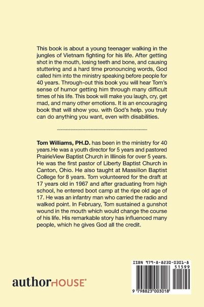 This book is about a young teenager walking in the jungles of Vietnam fighting for his life. After getting shot in the mouth, losing teeth and bone, and causing stuttering and a hard time pronouncing words, God called him into the ministry speaking before people for 40 years. Through-out this book you will hear Tom's sense of humor getting him through many difficult times of his life. This book will make you laugh, cry, get mad, and many other emotions. It is an encouraging book that will show you. with God's help. you truly can do anything you want, even with disabilities.