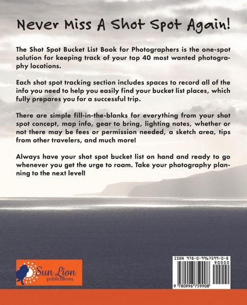 Never Miss A Shot Spot Again! The Shot Spot Bucket List Book for Photographers is the one-spot solution for keeping track of your top 40 most wanted photography locations. Each shot spot tracking section includes spaces to record all of the info you need to help you easily find your bucket list places, which fully prepares you for a successful trip. There are simple fill-in-the-blanks for everything from your shot spot concept, map info, gear to bring, lighting notes, whether or not there may be fees or permission needed, a sketch area, tips from other travelers, and much more! Always have your shot spot bucket list on hand and ready to go whenever you get the urge to roam. Take your photography planning to the next level!