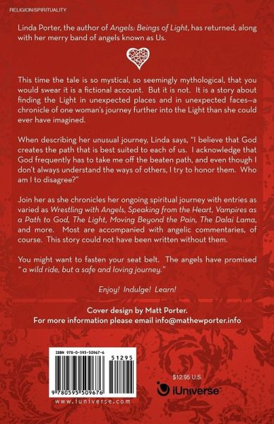 Linda Porter, the author of Angels: Beings of Light, has returned, along with her merry band of angels known as Us. This time the tale is so mystical, so seemingly mythological, that you would swear it is a fictional account. But it is not. It is a story about finding the Light in unexpected places and in unexpected faces-a chronicle of one woman's journey further into the Light than she could ever have imagined. When describing her unusual journey, Linda says, "I believe that God creates the path that is best suited to each of us. I acknowledge that God frequently has to take me off the beaten path, and even though I don't always understand the ways of others, I try to honor them. Who am I to disagree?" Join her as she chronicles her ongoing spiritual journey with entries as varied as Wrestling with Angels, Speaking from the Heart, Vampires as a Path to God, The Light, Moving Beyond the Pain, The Dalai Lama, and more. Most are accompanied with angelic commentaries, of course. This story could not have been written without them. You might want to fasten your seat belt. The angels have promised "a wild ride, but a safe and loving journey." Enjoy! Indulge! Learn! Cover design by Matt Porter. For more information please email info@mathewporter.info