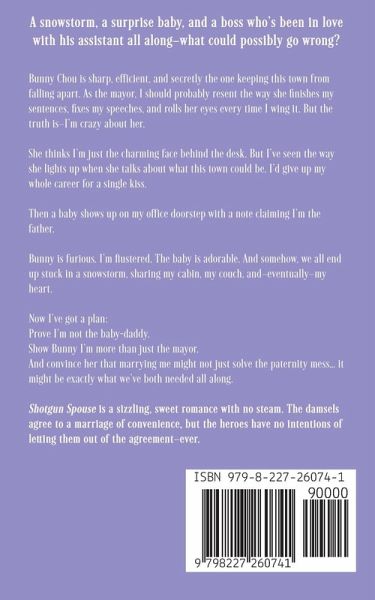 A snowstorm, a surprise baby, and a boss who's been in love with his assistant all along-what could possibly go wrong? Bunny Chou is sharp, efficient, and secretly the one keeping this town from falling apart. As the mayor, I should probably resent the way she finishes my sentences, fixes my speeches, and rolls her eyes every time I wing it. But the truth is-I'm crazy about her. She thinks I'm just the charming face behind the desk. But I've seen the way she lights up when she talks about what this town could be. I'd give up my whole career for a single kiss. Then a baby shows up on my office doorstep with a note claiming I'm the father. Bunny is furious. I'm flustered. The baby is adorable. And somehow, we all end up stuck in a snowstorm, sharing my cabin, my couch, and-eventually-my heart. Now I've got a plan: Prove I'm not the baby-daddy. Show Bunny I'm more than just the mayor. And convince her that marrying me might not just solve the paternity mess... it might be exactly what we've both needed all along. Shotgun Spouse is a sizzling, sweet romance with no steam. The damsels agree to a marriage of convenience, but the heroes have no intentions of letting them out of the agreement-ever.