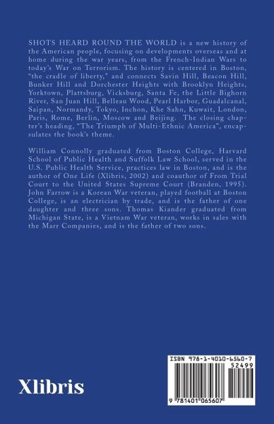 SHOTS HEARD ROUND THE WORLD is a new history of the American people, focusing on developments overseas and at home during the war years, from the French-Indian Wars to today's War on Terrorism. The history is centered in Boston, "the cradle of liberty," and connects Savin Hill, Beacon Hill, Bunker Hill and Dorchester Heights with Brooklyn Heights, Yorktown, Plattsburg, Vicksburg, Santa Fe, the Little Bighorn River, San Juan Hill, Belleau Wood, Pearl Harbor, Guadalcanal, Saipan, Normandy, Tokyo, Inchon, Khe Sahn, Kuwait, London, Paris, Rome, Berlin, Moscow and Beijing. The closing chapter's heading, "The Triumph of Multi-Ethnic America", encapsulates the book's theme.