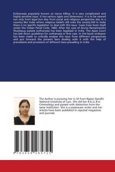 Euthanasia popularly known as mercy killing. It is very complicated and highly sensitive issue. It has various types and dimensions. It is to be viewed not only from legal but also from social and religious perspective also in a country like India where religious beliefs still rules the society.Still in India there is no specific legislation to deal with this issue. Cases have been dealt under the Indian Penal Code, 1860. After the case of Aruna Ramachandra Shanbaug passive euthanasia has been legalised in India. The Apex Court has laid down guidelines for euthanasia in that case. In this book endeavor has been made to critically analyse this issue from different perspectives and put forward the present laws dealing with it with the help of precedents and provisions of different laws prevailing in India.