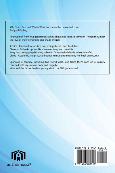 'Oh, East is East and West is West, and never the twain shall meet.' Rudyard Kipling. Four women from four generations who all have one thing in common - when they meet the love of their life turmoil and chaos ensues:- Jessica - Prepared to sacrifice everything she has ever held dear. Eleanor - Embarks upon a life she never imagined possible. Mary - An unhappy girl finding solace in fantasy which leads to her downfall. Chloe - Academic and practical but not immune from turning her back on security. Spanning a century, including two world wars, love takes them each on a journey touched with joy, sorrow, hope and tragedy. What will the future hold for young Mia in the fifth generation?