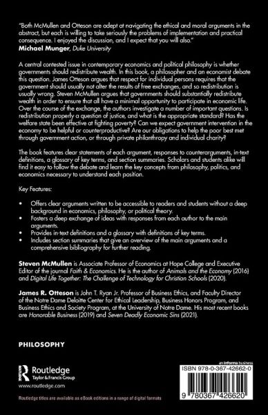 A central contested issue in contemporary economics and political philosophy is whether governments should redistribute wealth. In this book, a philosopher and an economist debate this question. James Otteson argues that respect for individual persons requires that the government should usually not alter the results of free exchanges, and so redistribution is usually wrong. Steven McMullen argues that governments should substantially redistribute wealth in order to ensure that all have a minimal opportunity to participate in economic life. Over the course of the exchange, the authors investigate a number of important questions. Is redistribution properly a question of justice, and what is the appropriate standard? Has the welfare state been effective at fighting poverty? Can we expect government intervention in the economy to be helpful or counterproductive? Are our obligations to help the poor best met through government action, or through private philanthropy and individualcharity?