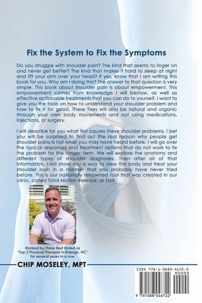 Do you struggle with shoulder pain? The kind that seems to linger on and never get better? The kind that makes it hard to sleep at night and lift your arm over your head? If yes, know that I am writing this book for you. Why am I doing this? The answer to that question is very simple. This book about shoulder pain is about empowerment. This empowerment comes from knowledge I will bestow, as well as effective actionable treatments that you can do to yourself. I want to give you the tools on how to understand your shoulder problem and how to fix it for good. These fixes will also be natural and organic through your own body movements and not using medications, injections, or surgery. I will describe for you what first causes these shoulder problems. I bet you will be surprised to find out the real reason why people get shoulder pains is not what you may have heard before. I will go over the typical responses and treatment options that do not work to fix the problem for the longer term. We will explore the anatomy and different types of shoulder diagnoses. Then after all of that information, I will show you a way to view the body and treat your shoulder pain in a manner that you probably have never tried before. This is our nationally renowned tool that was created in our clinic, called Total Motion Release, or TMR