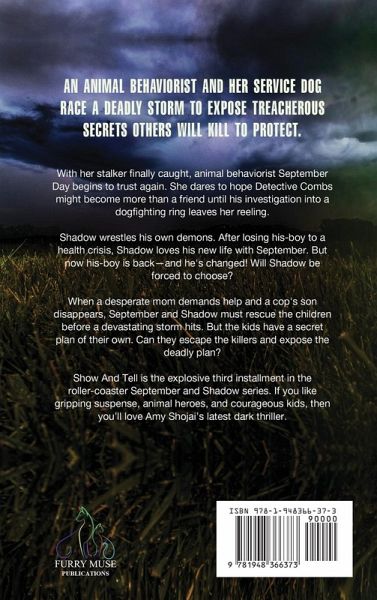 "Riveting, wholly satisfying ...makes us care." --Jon Land, USA Today bestselling author An animal behaviorist and her service dog race a deadly storm to expose treacherous secrets others will kill to protect. With her stalker finally caught, animal behaviorist September Day begins to trust again. She dares to hope Detective Combs might become more than a friend until his investigation into a dogfighting ring leaves her reeling. Shadow wrestles his own demons. After losing his-boy to a health crisis, Shadow loves his new life with September. But now his-boy is back--and he's changed! Will Shadow be forced to choose? When a desperate mom demands help and a cop's son disappears, September and Shadow must rescue the children before a devastating storm hits. But the kids have a secret plan of their own. Can they escape the killers and expose the deadly plan? Show And Tell is the explosive third installment in the roller-coaster September and Shadow series. If you like gripping suspense, animal heroes, and courageous kids, then you'll love Amy Shojai's latest dark thriller. Buy Show And Tell to join the hunt for justice today!