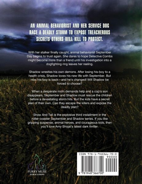 LARGE PRINT EDITION "Riveting, wholly satisfying ...makes us care." --Jon Land, USA Today bestselling author An animal behaviorist and her service dog race a deadly storm to expose treacherous secrets others will kill to protect. With her stalker finally caught, animal behaviorist September Day begins to trust again. She dares to hope Detective Combs might become more than a friend until his investigation into a dogfighting ring leaves her reeling. Shadow wrestles his own demons. After losing his-boy to a health crisis, Shadow loves his new life with September. But now his-boy is back--and he's changed! Will Shadow be forced to choose? When a desperate mom demands help and a cop's son disappears, September and Shadow must rescue the children before a devastating storm hits. But the kids have a secret plan of their own. Can they escape the killers and expose the deadly plan? Show And Tell is the explosive third installment in the roller-coaster September and Shadow series. If you like gripping suspense, animal heroes, and courageous kids, then you'll love Amy Shojai's latest dark thriller. Buy Show And Tell to join the hunt for justice today!