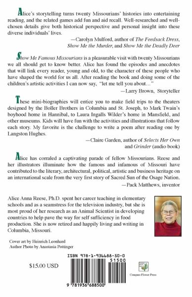 These mini-biographies of twenty Missourians will entice you to make field trips to the theaters designed by the Boller Brothers in Columbia and St. Joseph, to Mark Twain's boyhood home in Hannibal, to Laura Ingalls Wilder's home in Mansfield, and other museums. Kids will have fun with the activities and illustrations that follow each story.Alice has found the episodes and anecdotes that will link every reader, young and old, to the character of these people who have shaped the world for us all. Includes interesting biographies of Jesse James, Edwin Hubble, and many Missourians of international interest.