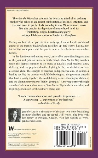 Reviewers called Jennifer Lauck's BLACKBIRD 'a standout debut' (Newsweek). Kirkus Reviews hailed its sequel, STILL WATERS, as 'a perfectly pitched tale of survival and the courage to move on'. Now this New York Times bestselling writer offers a book that takes readers into the playgrounds and battlegrounds of motherhood. SHOW ME THE WAY consists of funny, moving, ultimately uplifting stories that touch on every aspect of motherhood. In the book, Lauck talks about everything from breastfeeding to opening channels of communication to abuse awareness. She begins by asking: 'Are you going to have kids?' and offers what she considers the basic stepping stones and essential signposts along the daily journey through motherhood. Lauck charts her own personal growth throughout the parenting process, sharing the sweet and often surprising lessons she has learned from her children. Both motherhood guide and illuminating memoir, SHOW ME THE WAY is destined to be another classic on the art of being a parent today. As familiar and reassuring as sipping coffee with friends around the kitchen table, this is a book no mother should be without.