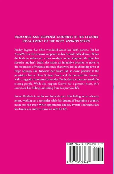 Romance and suspense continue in the second installment of the Hope Springs Series. Presley Ingram has often wondered about her birth parents. Yet her 23andMe test kit remains unopened in her bedside table drawer. When she finds an address on a torn envelope in her adoption file upon her adoptive mother's death, she makes an impulsive decision to travel to the mountains of Virginia in search of answers. In the charming town of Hope Springs, she discovers her dream job as an event planner at the prestigious Inn at Hope Springs Farms and the potential for romance with a ruggedly handsome bartender. Presley has an uncanny knack for reading people. While she suspects Everett has a genuine heart, she's convinced he's hiding something from his previous life. Everett Baldwin is on the run from his past. He's hiding out at a luxury resort, working as a bartender while his dreams of becoming a country music star slip away. When opportunity knocks, Everett is forced to face his demons in order to move on with his life.
