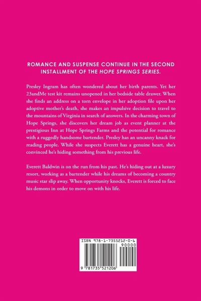 Two lost souls meet by chance in an explosive tale of romance and suspense. Presley Ingram has often wondered about her birth parents. Yet her 23andMe test kit remains unopened in her bedside table drawer. When she finds an address on a torn envelope in her adoption file upon her adoptive mother's death, she makes an impulsive decision to travel to the mountains of Virginia in search of answers. In the charming town of Hope Springs, she discovers her dream job as event planner at the prestigious Inn at Hope Springs Farms and the potential for romance with a ruggedly handsome bartender. Presley has an uncanny knack for reading people. While she suspects Everett has a genuine heart, she's convinced he's hiding something from his previous life. Everett Baldwin is on the run from his past. He's hiding out under an assumed name and working as a bartender while his dreams of becoming a country music star slip away. When opportunity knocks, Everett is forced to face his demons in order to move on with his life. Secrets are revealed and chaos ensues. Will Everett be able to salvage his relationship with the woman of his dreams?