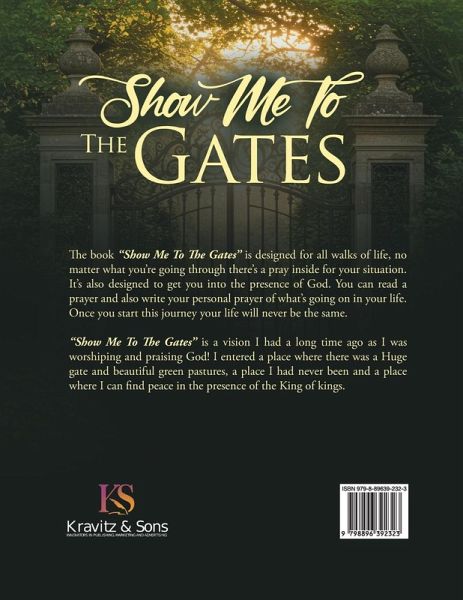 The book "Show Me To The Gates" is designed for all walks of life, no matter what you're going through there's a pray inside for your situation. It's also designed to get you into the presence of God. You can read a prayer and also write your personal prayer of what's going on in your life. Once you start this journey your life will never be the same. "Show Me To The Gates" is a vision I had a long time ago as I was worshiping and praising God! I entered a place where there was a Huge gate and beautiful green pastures, a place I had never been and a place where I can ¿nd peace in the presence of the King of kings.