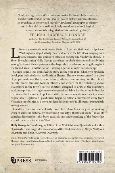 Like many western boomtowns at the turn of the twentieth century, Spokane, Washington, enjoyed a lively theatrical scene, ranging from plays, concerts, and operas to salacious variety and vaudeville shows. Yet even as Spokanites took pride in their city's reputation as a "good show town," the more genteel among them worried about its "Wild West" atmosphere. In Show Town, historian Holly George correlates the clash of tastes and sensibilities among Spokane's theater patrons with a larger shift in values occurring throughout the Inland West-and the nation-during a period of rapid social change. George begins this multifaceted story in 1890, when two Spokane developers built the lavish Auditorium Theater as a kind of advertisement for the young city. The new venue catered to a class of people made wealthy by speculation, railroads, and mining. Yet the refined entertainment the Auditorium offered conflicted with the rollicking shows that played in the town's variety theaters, designed to draw in the migratory workers-primarily single men-who provided labor for the same industries that made the fortunes of Spokane's elite. As well-to-do Spokanites attempted to clamp down on the variety theaters, performances at even the city's more respectable, "legitimate" playhouses began to reflect a movement away from Victorian sensibilities to a more modern desire for self-fulfillment-particularly among women. Theaters joined the debate over modern femininity by presenting plays on issues ranging from woman's suffrage to shifting marital expectations. At the same time, national theater monopolies transmitted to the people of Spokane new styles and tastes that mirrored larger cultural trends. Lucidly written and meticulously researched, Show Town is a groundbreaking work of cultural history. By examining one city's theatrical scene in all its complex dimensions, this book expands our understanding of the forces that shaped the urban American West.