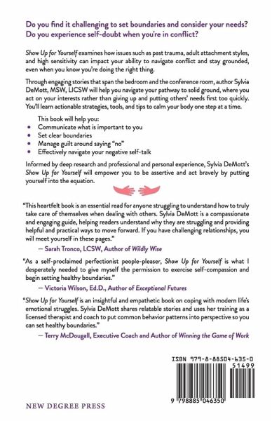 Do you find it challenging to set boundaries and consider your needs? Do you experience self-doubt when you're in conflict? Show Up for Yourself examines how issues such as past trauma, adult attachment styles, and high sensitivity can impact your ability to navigate conflict and stay grounded, even when you know you're doing the right thing. Through engaging stories that span the bedroom and the conference room, author Sylvia DeMott, MSW, LICSW will help you navigate your pathway to solid ground, where you act on your interests rather than giving up and putting others' needs first too quickly. You'll learn actionable strategies, tools, and tips to calm your body one step at a time. This book will help you:Communicate what is important to you Set clear boundaries Manage guilt around saying "no" Effectively navigate your negative self-talk Informed by deep research and professional and personal experience, Sylvia DeMott's Show Up for Yourself will empower you to be assertive and act bravely by putting yourself into the equation.
