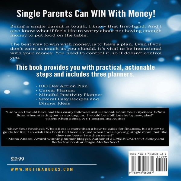 Single Parents Can WIN With Money! Being a single parent is really tough. I know that first-hand. And I also know what it feels like to worry about not having enough money to pay the rent, or put food on the table. I'll never forget how it felt to stand in line at the grocery story, and wonder how I would pay for the food that my children needed. When I was growing up, my parents thought they were teaching me about money. They taught me how to balance a checkbook, but I never learned how to make sure I was spending less than I made. I needed a plan. In Show Your Paycheck Who's Boss, we cover financial topics that are specific to single parents. Do you pay or receive child support? How should you handle paying for birthday and holiday gifts? What if your kids just want to eat pizza all the time? Along with practical advice about getting rid of debt and saving for emergencies and retirement, we've included three planners:Mindful Positivity Planner Career Planner 100 Day Action Plan Single parents really can be successful financially - and you can teach your kids how to do it, too!