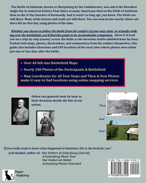 * Over 40 Full-size Battlefield Maps * Nearly 200 Photos of Participants and Battlefield * Google Map Coordinates for All Tour Stops * Then & Now Photos of Battlefield Locations The Antietam is a large creek that runs about a mile east and south of the small hamlet of Sharpsburg, Maryland. Despite its attractive name, Antietam was a man-made disaster, its name signifying horror to the participants and to generations of their families. Some 6,400 Americans were killed or mortally wounded on that day, which is more than those killed in the War of 1812, the Mexican-American War, the Spanish-American War and all the Indian wars, combined. At a time when the American population was a fraction of what it is today, the deaths at Antietam were more than twice the number killed at the World Trade Center, and four times the number killed on D-Day. Then of course there were the wounded and maimed. About 15,000 of them. Many would later die of their wounds, not counted as killed on the field. And an exceptional percentage of these wounded would go under the knife of the surgeons, aptly named "saw-bones," on the kitchen table of a local farmer's house, and then laid in some filthy straw in a dank barn, to either live or die. For those that lived, usually teenagers, they could look forward to spending the remainder of their lives hobbling around on a crude wooden crutch, or minus an arm or two, no longer capable of doing a man's work of that time. And particularly for the Southerners, don't count too much on any government assistance after the war. While this battlefield tour must by necessity focus on the "big picture" - the generals, the map arrows, the movements of divisions, brigades and regiments, etc. - I do from time to time try to include insights from the privates and corporals in the maelstrom, so that we don't forget that on the ground, down at the regiment, company, and individual level, Antietam was not just lines on a map; it was a brutal fight between flesh and blood men who believed so completely in their cause that they were quite willing to kill or be killed to settle their differences. And it wasn't all that long ago, you know. Sharpsburg's still there; the Antietam's still there; most of the same roads are still there; and thanks to the Park Service most of the houses and farms are still there. It's just a question of walking around the battlefield and remembering what actually happened there. In many ways, for me at least, Antietam was just the day before yesterday. And that's pretty much the way I wrote this book. Jack Kunkel