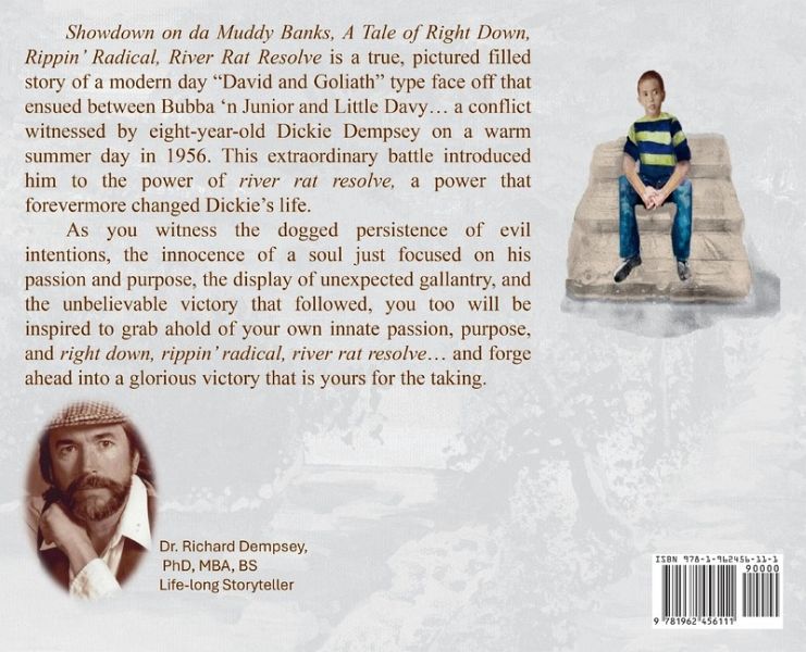 Showdown on da Muddy Banks, A Tale of Right Down, Rippin' Radical, River Rat Resolve is a true, pictured filled story of a modern day "David and Goliath" type face off that ensued between Bubba 'n Junior and Little Davy... a conflict witnessed by eight-year-old Dickie Dempsey on a warm summer day in 1956. This extraordinary battle introduced him to the power of river rat resolve, a power that forevermore changed the way Dickie viewed the roadblocks and pitfalls of life. As you witness the dogged persistence of evil intentions, the innocence of a soul just focused on his passion and purpose, the display of unexpected gallantry, and the unbelievable victory that followed, you too will be inspired to grab ahold of your own innate passion, purpose, and right down, rippin' radical, river rat resolve... and forge ahead into a glorious victory that is yours for the taking.