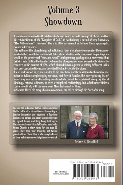 Showdown. (Volume 3 of "Adventures in King's Fountain.") The Lord shows His pleasure at the progress of His new work, and promises His selected company the blessings of His own work within each one of them. Although this is a testing time, and one that is difficult for them to endure, they come to realise that gold has to be refined, and dross removed from silver. A heart-warming progression of the story that has an amazing final scene.