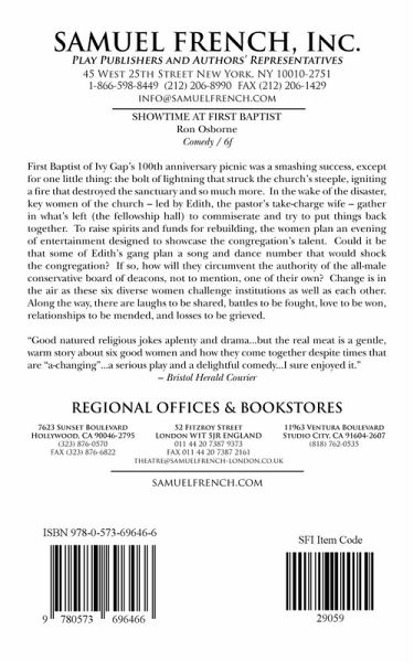Dramatic Comedy / 6f Showtime at First Baptist is the sequel to the hugely popular and widely produced First Baptist of Ivy Gap. First Baptist of Ivy Gap's 100th anniversary picnic was a smashing success, except for one little thing: the bolt of lightning that struck the church's steeple, igniting a fire that destroyed the sanctuary and so much more. In the wake of the disaster, key women of the church - led by Edith, the pastor's take-charge wife - gather in what's left (the fellowship hall)