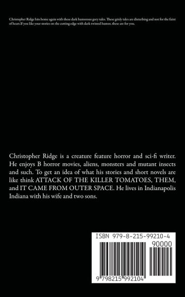 Christopher Ridge hits home again with these dark humorous gory tales. These grisly tales are disturbing and not for the faint of heart.If you like your stories on the cutting edge with dark twisted humor, these are for you.