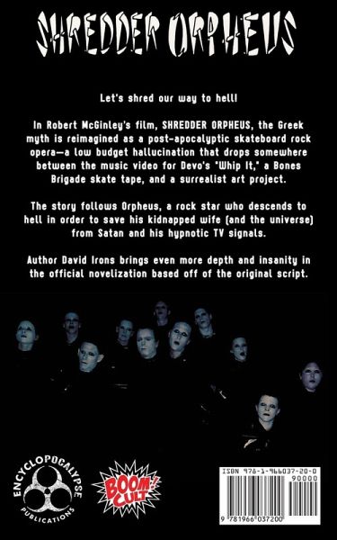 Let's shred our way to hell! In Robert McGinley's film, SHREDDER ORPHEUS, the Greek myth is reimagined as a post-apocalyptic skateboard rock opera-a low budget hallucination that drops somewhere between the music video for Devo's "Whip It," a Bones Brigade skate tape, and a surrealist art project. The story follows Orpheus, a rock star who descends to hell in order to save his kidnapped wife (and the universe) from Satan and his hypnotic TV signals. Author David Irons brings even more depth and insanity in the official novelization based off of the original script.