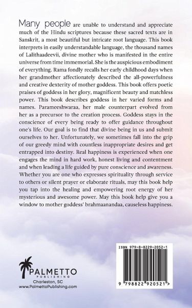Many people are unable to understand and appreciate much of the Hindu scriptures because these sacred texts are in Sanskrit, a most beautiful but intricate root language. This book interprets in easily understandable language, the thousand names of Lalithaadeevii, divine mother who is manifested in the entire universe from time immemorial. She is the auspicious embodiment of everything. Rama fondly recalls her early childhood days when her grandmother affectionately described the all-powerfulness and creative dexterity of mother goddess. This book offers poetic praises of goddess in her glory, magnificent beauty and matchless power. This book describes goddess in her varied forms and names. Parameeshwaraa, her male counterpart evolved from her as a precursor to the creation process. Goddess stays in the conscience of every being ready to offer guidance throughout one's life. Our goal is to find that divine being in us and submit ourselves to her. Unfortunately, we sometimes fall into the grip of our greedy mind with countless inappropriate desires and get entrapped into destiny. Real happiness is experienced when one engages the mind in hard work, honest living and contentment and when leading a life guided by pure conscience and awareness. Whether you are one who expresses spirituality through service to others or silent prayer or elaborate rituals, may this book help you tap into the healing and empowering root energy of her mysterious and awesome power. May this book help give you a window to mother goddess' brahmaanandaa, causeless happiness.