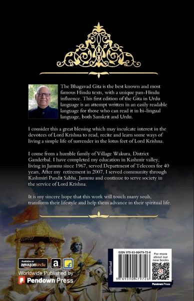 The Bhagavad Gita is the best known and most famous Hindu texts, with a unique pan-Hindu influence. This first edition of the Gita in Urdu language is an attempt written in an easily readable language for those who can read it in bi-lingual language, both Sanskrit and Urdu. I consider this a great blessing which may inculcate interest in the devotees of Lord Krishna to read, recite and learn some ways of living a simple life of surrender in the lotus feet of Lord Krishna. I come from a humble family of Village Wakura, District Ganderbal. I have completed my education in Kashmir valley, living in Jammu since 1967, served Department of Telecom for 40 years, After my retirement in 2007, I served community through Kashmiri Pandit Sabha, Jammu and continue to serve society in the service of Lord Krishna. It is my sincere hope that this work will touch many souls, transform their lifestyle and help them advance in their spiritual life.