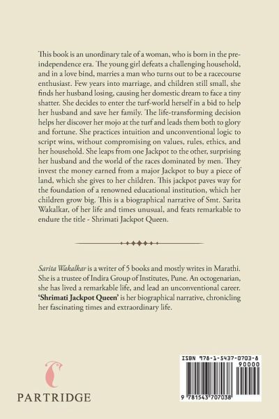 This book is an unordinary tale of a woman, who is born in the pre-independence era. The young girl defeats a challenging household, and in a love bind, marries a man who turns out to be a racecourse enthusiast. Few years into marriage, and children still small, she finds her husband losing, causing her domestic dream to face a tiny shatter. She decides to enter the turf-world herself in a bid to help her husband and save her family. The life-transforming decision helps her discover her mojo at the turf and leads them both to glory and fortune. She practices intuition and unconventional logic to script wins, without compromising on values, rules, ethics, and her household. She leaps from one Jackpot to the other, surprising her husband and the world of the races dominated by men. They invest the money earned from a major Jackpot to buy a piece of land, which she gives to her children. This jackpot paves way for the foundation of a renowned educational institution, which her children grow big. This is a biographical narrative of Smt. Sarita Wakalkar, of her life and times unusual, and feats remarkable to endure the title - Shrimati Jackpot Queen.
