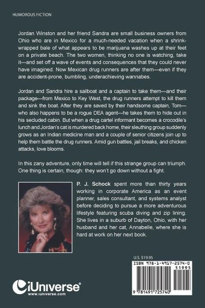 Jordan Winston and her friend Sandra are small business owners from Ohio who are in Mexico for a much-needed vacation when a shrink-wrapped bale of what appears to be marijuana washes up at their feet on a private beach. The two women, thinking no one is watching, take it—and set off a wave of events and consequences that they could never have imagined. Now Mexican drug runners are after them—even if they are accident-prone, bumbling, underachieving wannabes. Jordan and Sandra hire a sailboat and a captain to take them—and their package—from Mexico to Key West, the drug runners attempt to kill them and sink the boat. After they are saved by their handsome captain, Tom— who also happens to be a rogue DEA agent—he takes them to hide out in his secluded cabin. But when a drug cartel informant becomes a crocodile’s lunch and Jordan’s cat is murdered back home, their sleuthing group suddenly grows as an Indian medicine man and a couple of senior citizens join up to help them battle the drug runners. Amid gun battles, jail breaks, and chicken attacks, love blooms. In this zany adventure, only time will tell if this strange group can triumph. One thing is certain, though: they won’t go down without a fight.
