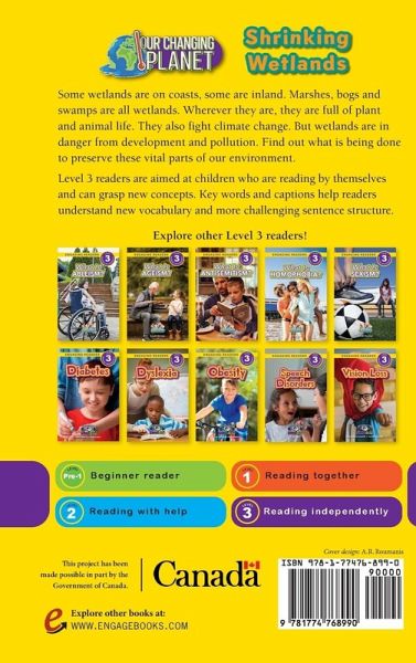 Some wetlands are on coasts, some are inland. Marshes, bogs and swamps are all wetlands. Wherever they are, they are full of plant and animal life. They also fight climate change. But wetlands are in danger from development and pollution. Find out what is being done to preserve these vital parts of our environment. Level 3 readers are aimed at children who are reading by themselves and can grasp new concepts. Key words and captions help readers understand new vocabulary and more challenging sentence structure. This project has been made possible in part by the Government of Canada.